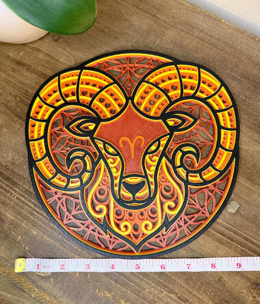Aries Zodiac Mandala Wall Art | 3D Printed Astrology Decor | Red Orange Yellow Black | Horoscope Gift