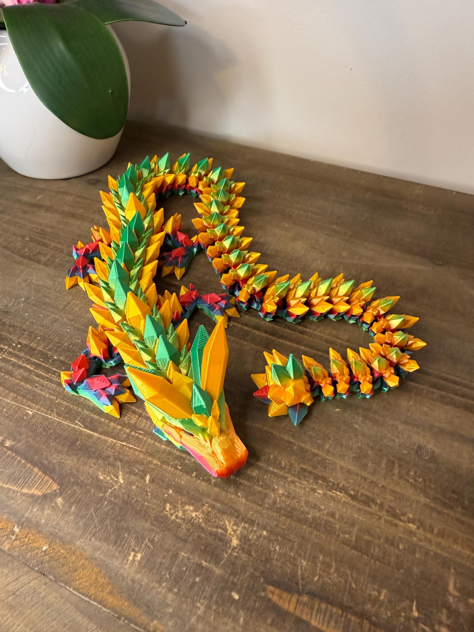 Perfect for display on a shelf, desk, or as the centerpiece of a fantasy collection, this dragon combines the artistry of 3D printing with bold, vibrant colors. The shimmering crystal effect is achieved through multicolor filament so the finish is durable and will not chip.