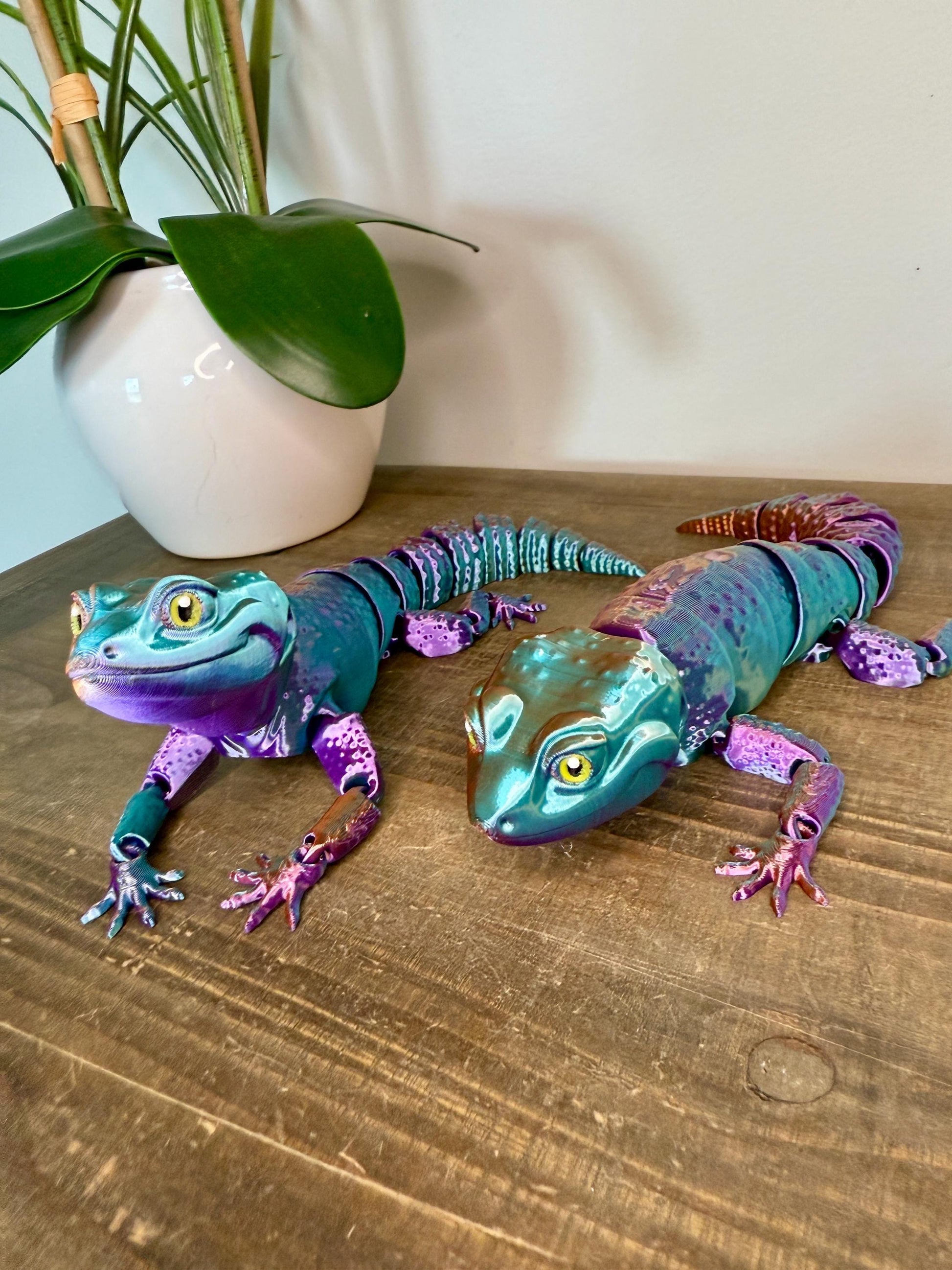 3D printed in tri-color PLA filament, the vibrant color shifts happen naturally during printing, creating a bold, fade-resistant finish without any paint or coatings. Every lizard comes out with its own one-of-a-kind pattern.